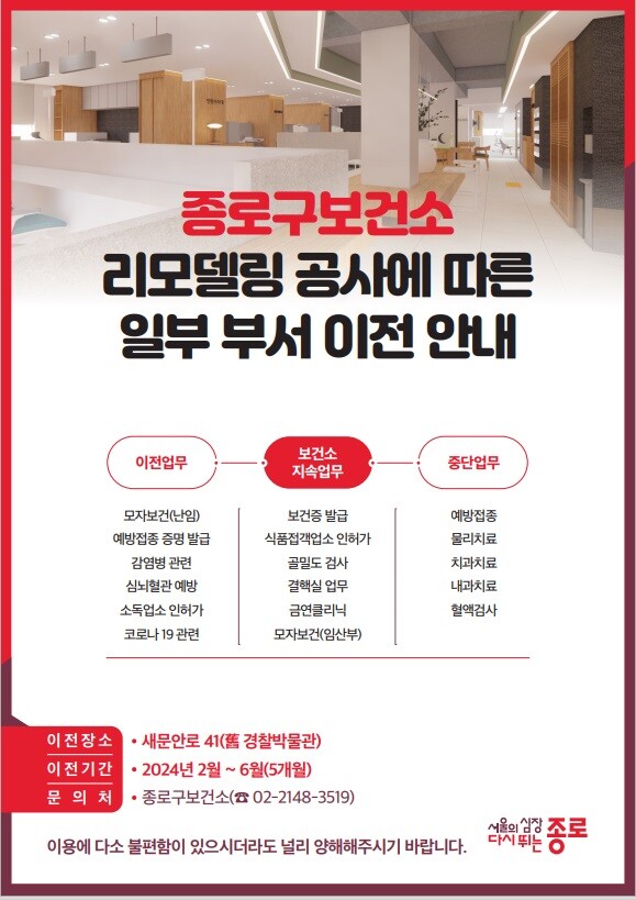 [시민일보 = 이대우 기자] 서울 종로구(구청장 정문헌)가 오는 6월까지 보건소 시설 개선을 위한 실내 리모델링 공사를 추진한다.