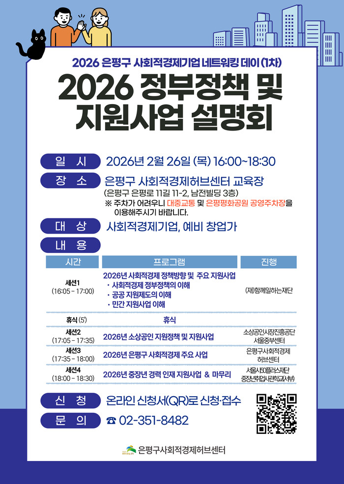 설명회는 총 4개 세션으로 구성된다. ▲2026년 사회적경제 정책 방향 및 주요 지원사업 ▲소상공인 지원정책 및 지원사업 ▲은평구 사회적경제 주요 사업 ▲중장년 경력 인재 지원사업을 소개한다.