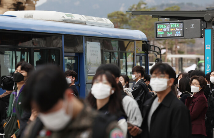| ▲ 15일 오전 서울시내 한 버스정류장에서 마스크를 쓴 출근길 시민들이 버스를 기다리고 있다. 오는 20일부터 버스와 전철 등 대중교통에서도 실내 마스크 착용 의무가 해제되고 자율로 전환된다. (사진=연합뉴스 제공) |