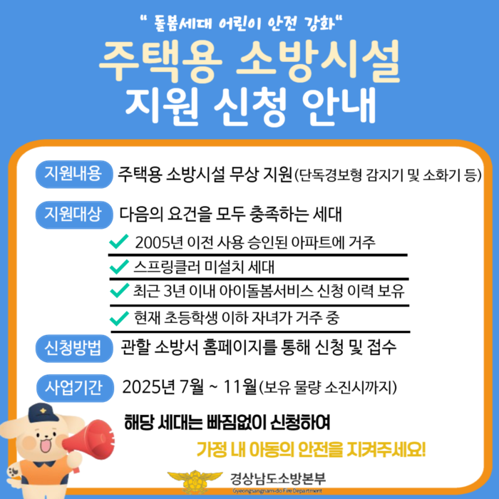 지원 대상은 ▲사용 승인 20년 이상 경과한 아파트 거주 ▲스프링클러 미설치 세대 ▲최근 3년 이내 아이돌봄서비스 신청 이력 ▲초등학생 이하 자녀 거주 등 요건을 모두 충족해야 한다.
