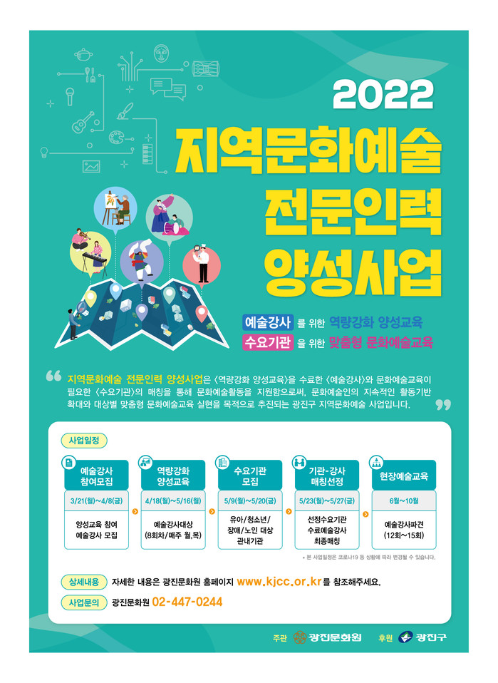 [시민일보 = 여영준 기자] 광진구(구청장 김선갑)는 광진문화원과 함께 ‘2022년 지역문화예술 전문인력 양성 사업’을 추진한다고 밝혔다.