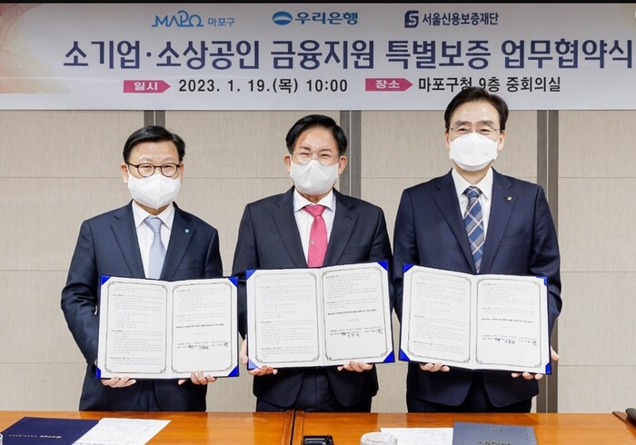 | ▲ 지난 1월 열린 마포구-우리은행-서울 신용보증재단 소기업·소상공인 금융지원 특별보증 업무협약식에서 박강수 구청장(가운데)이 협약 체결 후 관계자들과 기념촬영을 하고 있는 모습. (사진=우리은행 제공) |