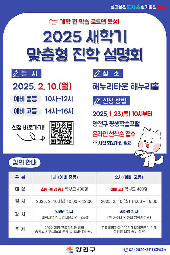 [시민일보 = 박소진 기자] 서울 양천구(구청장 이기재)가 23일부터 예비 중·고등학생 학부모 대상 ‘새학기 대비 맞춤형 진학 설명회’ 참가 신청 접수받는다.