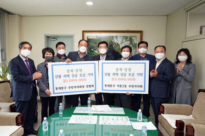 동대문구에 경북·강원 산불 피해로 고통받는 지역 주민들을 위한 따뜻한 마음이 전해지고 있다. 사진은 최근 동대문구 주민자치회장 연합회가 성금 100만원을, 이문2동 주민자치회가 성금 300만원을 동대문구에 전달한 뒤 유덕열 구청장(가운데)과 기념촬영을 하고 있는 모습. (사진제공=동대문구청)