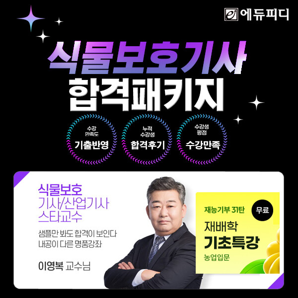 강의는 에듀피디 식물보호산업기사 전임 이영복 교수가 맡아 최신 출제경향과 신유형 문제에 맞춰 주요 개념과 배경지식을 알기 쉽게 정리해 주고 빈출 문제 유형별 문제 공략법을 알려줘 단기간 학습만으로도 합격 점수를 완성할 수 있는 고효율 학습 전략을 지원한다.