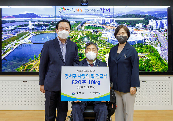 서울 강서구는 20일 (사)함께하는 사랑밭으로부터 장애인의 날 기념 후원물품으로 쌀 10kg·820포를 전달받았다. 기탁받은 쌀은 지역내 장애인시설과 단체에 전달될 예정이다. 사진은 전달식에서 노현송 구청장(왼쪽)이 관계자들과 기념촬영을 하는 모습. (사진제공=강서구청)