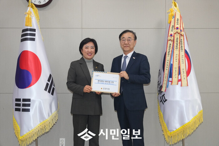 | ▲ 신수정 광주광역시의장(왼 쪽)이 24일 김윤덕 국토교통부장관에게 광주시 핵심 현안 사업 해결을 위한 국비지원 요청 건의서를 전달 한 후 기념촬영을 하고 있다. / 광주광역시의 제공 |