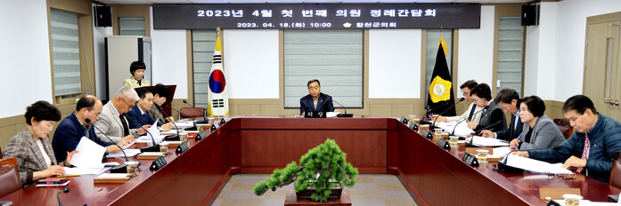 군의원, 관계 공무원 등 20여 명이 참석한 이 날 간담회에서는 2024년 가축분뇨공동자원화시설 개보수사업 공모계획, 비전2040 합천군 장기발전종합계획 수립연구 용역 추진 등 군정 주요 현황에 대한 부서장의 보고와 함께 각종 의정 운영사안에 관한 의원 간 협의 등을 진행했다.