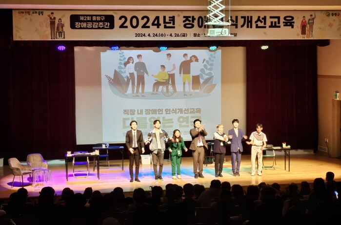 중랑구가 ‘제2회 중랑구 장애공감주간’을 맞이해 24~26일 사흘간 구민과 전 직원 1200여명을 대상으로 문화체험형 장애인식개선교육을 실시, 연극과 콘서트·영화 상영 등으로 진행했다. 사진은 교육이 진행되고 있는 모습. (사진=중랑구청 제공)