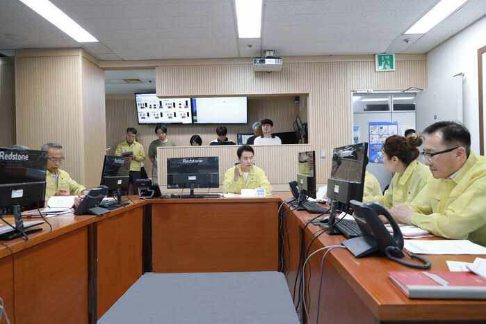 오언석 서울 도봉구청장이 6호 태풍 ‘카눈’의 북상 소식에 여름휴가를 반납하고 9일 ‘태풍 점검 회의’를 개최했다. 사진은 오 구청장(가운데)이 부서별 태풍 대비 준비사항 등을 살피고 있는 모습. (사진=도봉구청 제공)