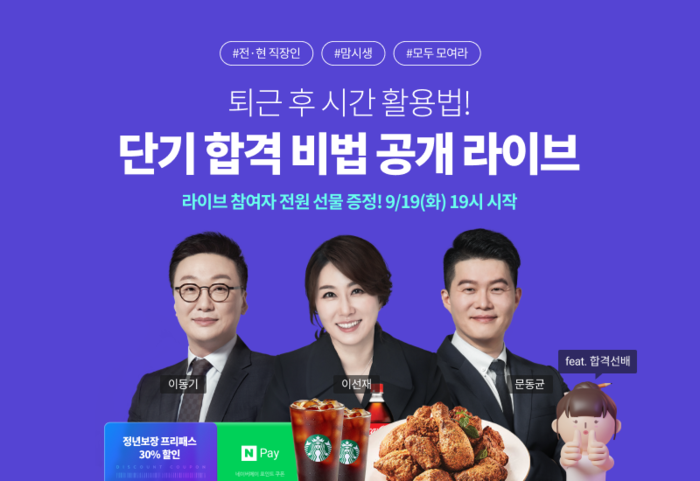 공단기 강사인 이선재(국어), 이동기(영어), 문동균(한국사) 강사와 더불어 36세 이상의 합격생도 함께 참여할 예정이다. 이번 라이브는 단기 합격을 목표로 하는 36세(1989년생) 이상의 수험생 맞춤형으로 진행된다.