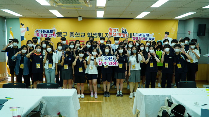 서울 강동구는 최근 중학생 학생회 자치활동 네트워크 ‘아름드리’ 8기 발대식을 개최했다. 발대식에서는 그룹별 활동 계획을 논의하고 학생대표를 선출했다. 사진은 이날 발대식 참가자들이 기념촬영을 하는 모습. (사진제공=강동구청)