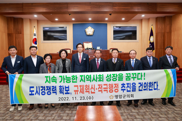 | ▲ 영암군의원들이 ‘도시경쟁력 확보, 규제혁신·적극행정 추진’ 문구가 적힌 플래카드를 들고 있다. (사진제공=영암군의회) |