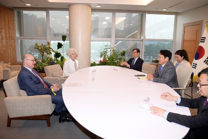 | ▲ 강기정 광주광역시장이 6일 오후 시청 접견실에서 광주비엔날레 개막식 참석을 위해 방문한 볼프강 앙거홀처 주한 오스트리아 대사를 만나 협력방안 등을 논의하고 있다./광주광역시 제공 |