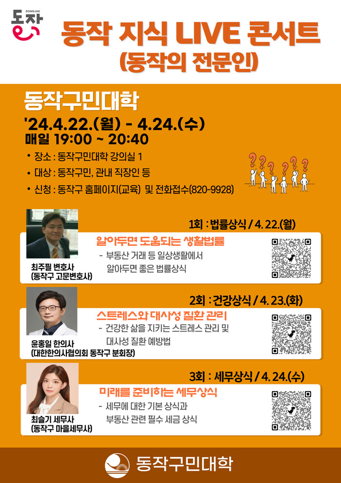 첫날인 22일에는 동작구 고문변호사인 최주필 변호사가 <알아두면 도움되는 생활법률>이라는 주제로 부동산 거래 등 생활 속 상황에서 필요한 법률 상식을 알려준다.