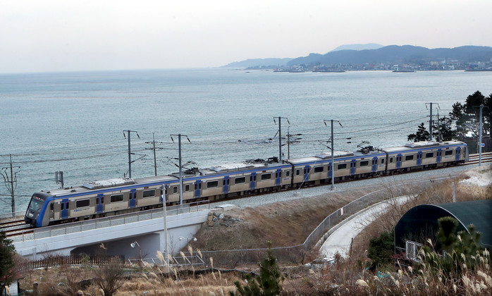 동해선 2단계 구간이 개통된 28일 오후 광역전철이 부산 기장군 월내-좌천 구간을 달리고 있다. 이날 동해선 2단계 개통에 따라 부산 부전에서 일광까지 운행하던 광역전철이 울산 태화강역까지 운행한다.