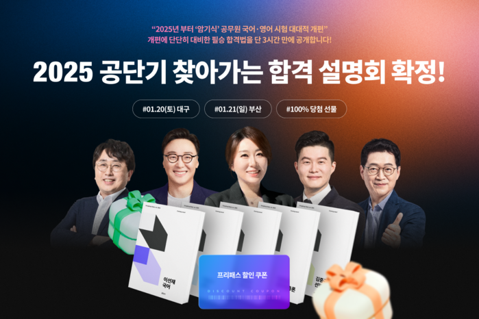 설명회 참여자들에게 다양한 혜택을 제공하고자 개편된 2025 시험에 대비할 수 있는 2025년 교재 및 2024 교재, 교보문고 5만원권과 맘스터치 치킨 기프티콘 등을 추첨을 통해 제공한다. 프리패스 할인권, 단기고득점방법론 교재와 던킨도너츠 잉글리쉬 머핀 등은 전원에게 선물로 제공할 예정이다. 이와 더불어, 17일까지 온라인에서 Q&A 이벤트와 소문내기 이벤트도 함께 진행한다.