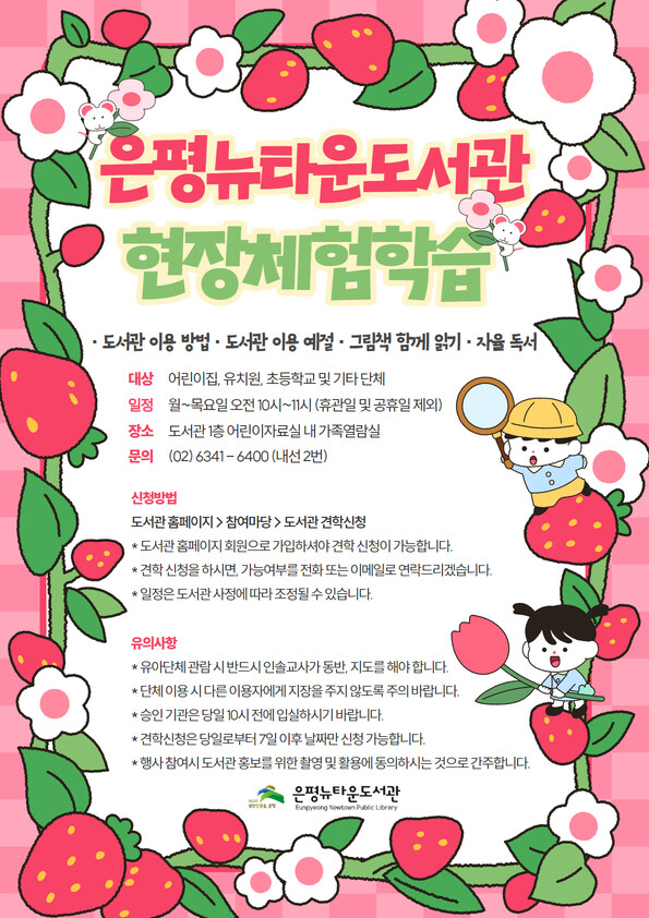장소는 은평뉴타운도서관 1층 어린이자료실 내 가족열람실에서 진행된다. 참여를 원하는 단체는 도서관 홈페이지에서 회원가입 후 ‘도서관 견학 신청’ 페이지를 통해 신청할 수 있다.