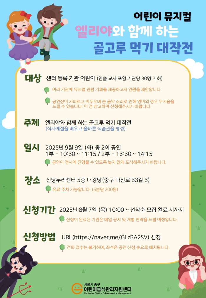 구는 오는 9월9일 신당누리센터 5층 대강당에서 뮤지컬 <엘리야와 함께 하는 골고루 먹기 대작전>을 오전 10시 30분과 오후 1시 30분, 총 두 차례에 걸쳐 무료로 선보인다. 공연 관람은 관내 어린이집과 유치원을 대상으로 선착순 모집 중이다.