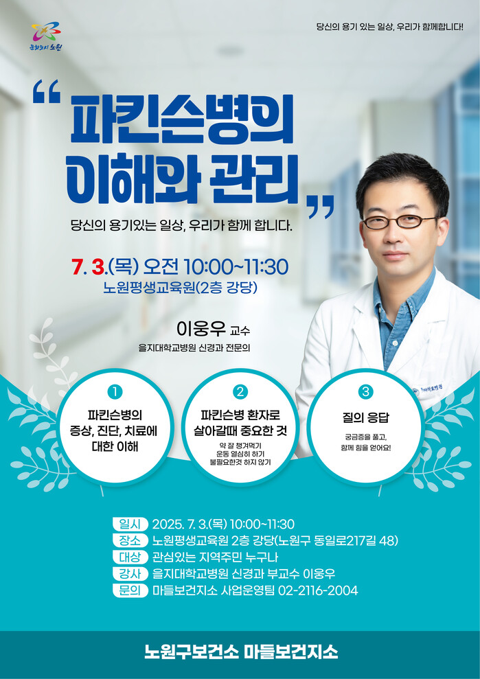구는 파킨슨병에 대한 올바른 정보를 제공하고 조기 발견의 중요성을 알리기 위해 주민 대상 건강 강연을 마련했다. 강연은 노원 평생교육원 2층 강당에서 진행되며, 누구나 사전 신청 없이 무료로 참석할 수 있다.