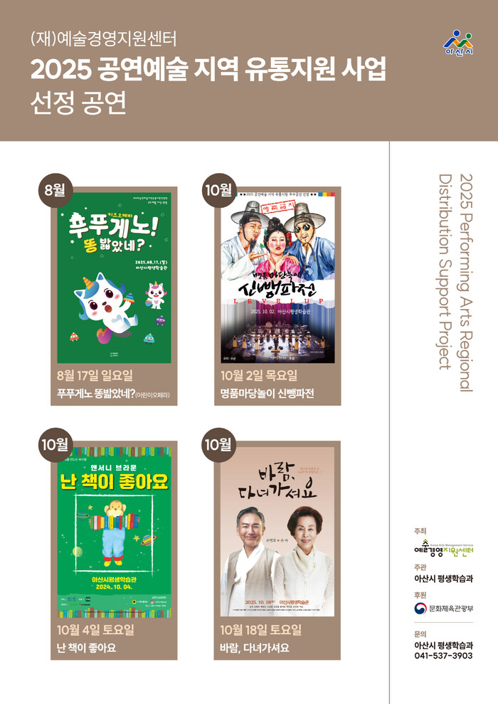 ▲10월2일 전통예술 심청전을 재해석한 ‘신 뺑파전’ ▲10월4일 앤서니브라운의 동화 뮤지컬 ‘난 책이 좋아요’ ▲10월18일은 손숙ㆍ손병호 주연의 연극 ‘바람 다녀가셔요’ 등 총 4편의 공연을 오는 10월까지 아산시 평생학습관 아산 아트홀에서 선보일 예정이다.