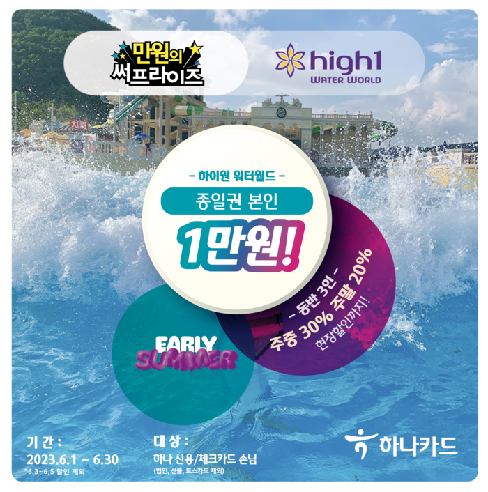 하나카드의 ‘Early Summer’ 이벤트는 먼저 물놀이와 관련한 다양한 혜택이 준비돼 있다. ▲하이원 워터월드에서 진행 되는 ‘만원의 써프라이즈’ 이벤트는 입장권 본인 1만원 및 동반 3인 최대 30% 할인의 혜택을 제공한다.