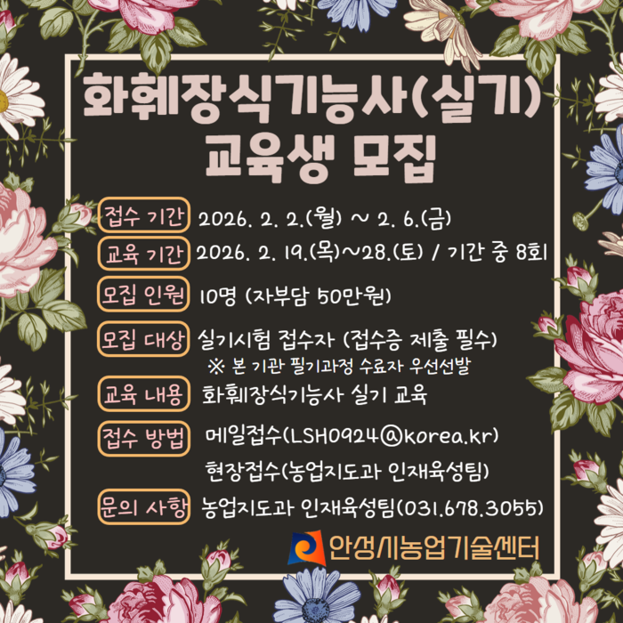 [안성=오왕석 기자] 안성시농업기술센터는 오는 2월 2일부터 2월 6일까지 화훼장식기능사 실기반 교육생을 모집한다고 밝혔다.