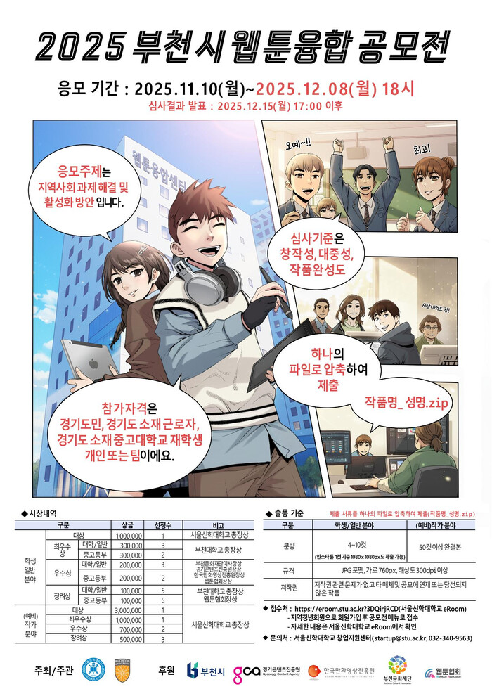 [부천=문찬식 기자] 경기 부천시는 10일부터 오는 12월8일까지 서울신학대학교 ‘이룸(eRoom)’ 플랫폼을 통해 지역 웹툰 창작 생태계를 조성하고 차세대 창의인재를 발굴하기 위한 ‘2025 부천시 웹툰융합공모전’을 개최한다.