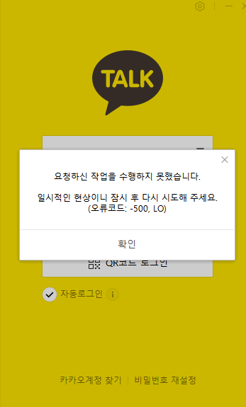 카톡 서버장애는 3시 30분께부터 발생했으며, PC버전에서 접속 시도시 '오류코드 -500, LO'이란 메세지창이 뜨고있다.