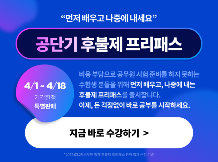 [시민일보 = 여영준 기자] 에스티유니타스의 공무원 시험 전문 브랜드 ‘공단기’는 먼저 배우고 나중에 결제하는 ‘후불제 프리패스’를 오는 18일까지 기간한정으로 선보인다고 1일 밝혔다.