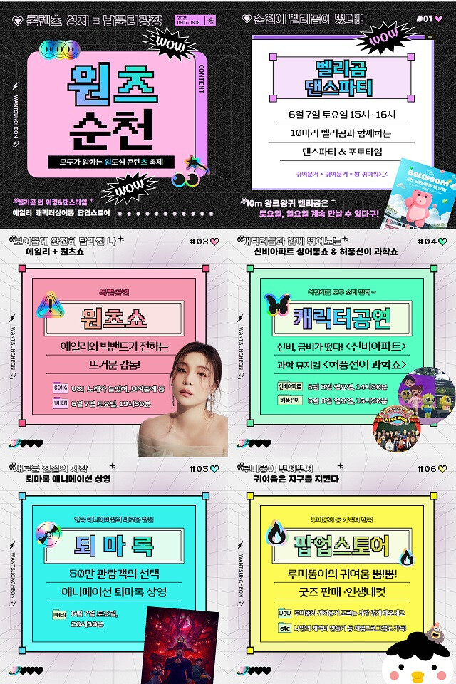 행사장인 남문터 광장은 이번 ‘원츠 순천’ 행사 기간동안 순천 대표 캐릭터와 콘텐츠로 꾸며져 도심 속에서 즐기는 이색 콘텐츠 축제의 중심지로 거듭날 전망이다.