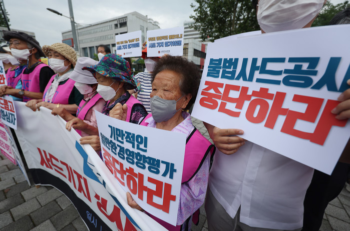 23일 용산 대통령실 앞에서 사드철회 평화회의 주최로 '사드기지 정상화 반대, 성주, 김천 주민 상경 투쟁' 기자회견이 열리고 있다.