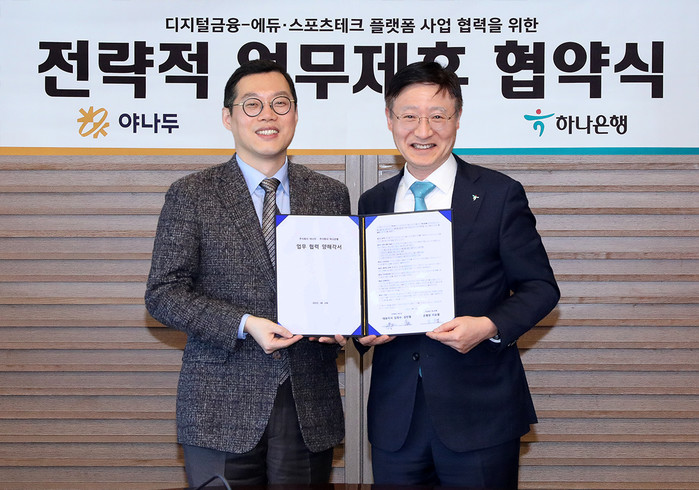 하나은행에 따르면 이번 협약은 야나두의 에듀·스포츠테크 플랫폼에 하나은행의 금융서비스를 결합하는 등 일상 생활에 디지털 금융이 함께 할 수 있는 신규 비즈니스를 발굴하고, 양사 회원을 대상으로 금융 및 에듀·스포츠테크 서비스 혜택을 제공하기 위해 마련됐다.