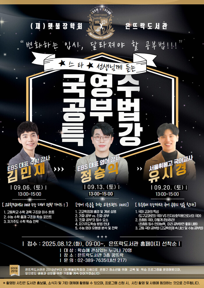 이번 특강은 오는 9월 6일부터 20일까지 매주 토요일 오후 1시부터 3시까지 은뜨락도서관에서 총 3회에 걸쳐 진행된다. 과목별 강연은 ▲수학은 9월 6일, 김민재 EBS 강사 ▲영어는 9월 13일, 정승익 EBS 강사 ▲국어는 9월 20일, 유시경 서울 휘봉고 교사가 진행한다.