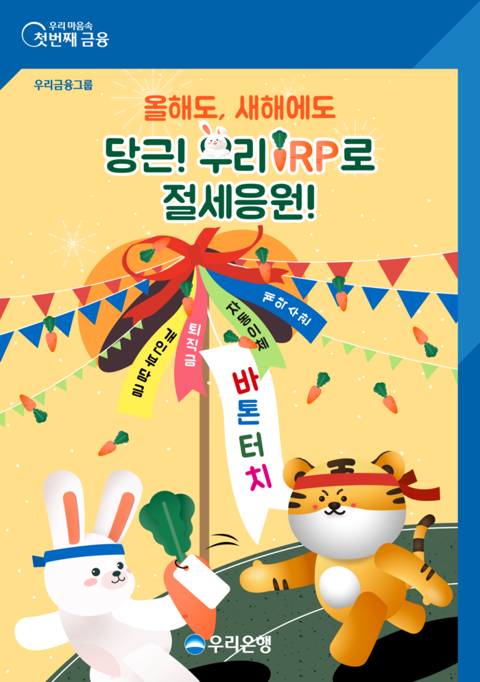 [시민일보 = 홍덕표 기자] 우리은행은 비대면으로 개인형 퇴직연금(IRP)를 신규가입하거나 자동이체등록·변경한 고객 대상으로 ‘올해도, 내년에도 당근! 우리IRP 절세응원’ 이벤트를 오는 12월31일까지 실시한다고 18일 밝혔다.