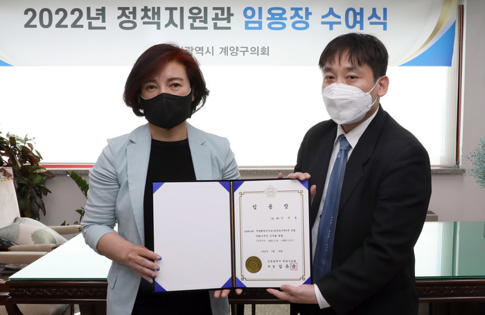 [인천=문찬식 기자] 인천 계양구의회가 최근 의장실에서 신규 채용한 정책지원관에 대한 임용장을 교부했다.
