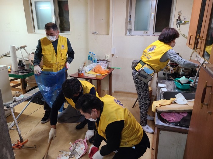 경기 구리시 수택2동 행정복지센터가 18일 구리라이온스클럽과 지하층에 위치한 열악한 주택에서 거주하는 홀몸노인 2가구에 도배와 장판 교체 등 집수리를 무료로 지원했다. 사진은 봉사자들이 대상 가구에 집수리를 하고 있는 모습. (사진제공=구리시청)