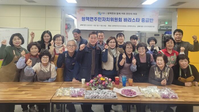 박은숙 쌍책면장은 “그 동안 지역발전을 위해 ‘커피베리에이션 자격증반’을 계획하고 진행한 위원장님과 위원 여러분께 감사 인사를 드린다”며 “열의를 가지고 배우시는 주민들을 보니 추후에 조성될 지역카페가 쌍책면 발전에 큰 도움이 될 것 같다. 앞으로도 주민들의 여가활동을 위해 행정에서도 아낌없이 지원하겠다”고 전했다.