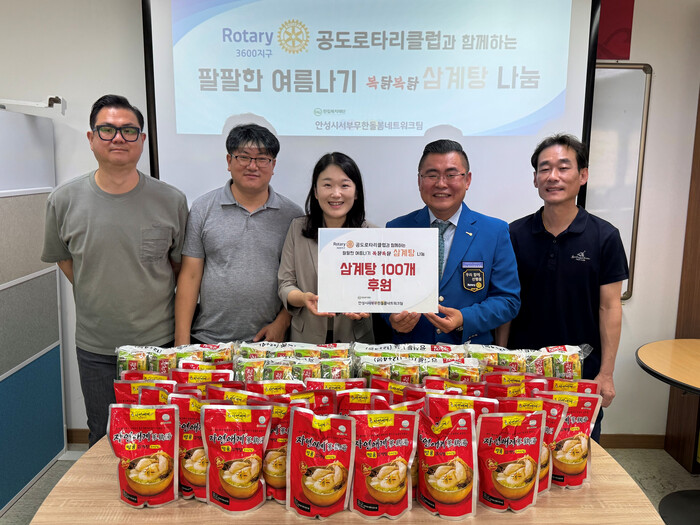 [안성=오왕석 기자] 사회복지법인 한길복지재단(이사장 한창섭)에서 수탁 운영하는 안성시서부무한돌봄네트워크팀(센터장 유성아)은 국제로타리 3600지구 공도로타리클럽(회장 김영구)과 지난 29일 ‘팔팔한 여름나기 복닭복닭 삼계탕 나눔’ 전달식을 가졌다.