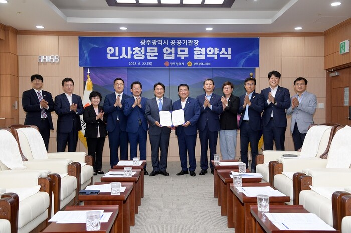 광주광역시(시장 강기정)와 광주광역시의회는 22일 시의회 열린시민홀에서 ‘공공기관장 인사청문 대상 확대를 위한 협약’을 체결했다.