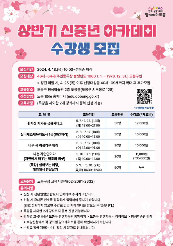 구에 주소지를 둔 46~64세 주민이라면 누구나 신청 가능하다. 신청은 도봉배움e누리집에서 가능하다.