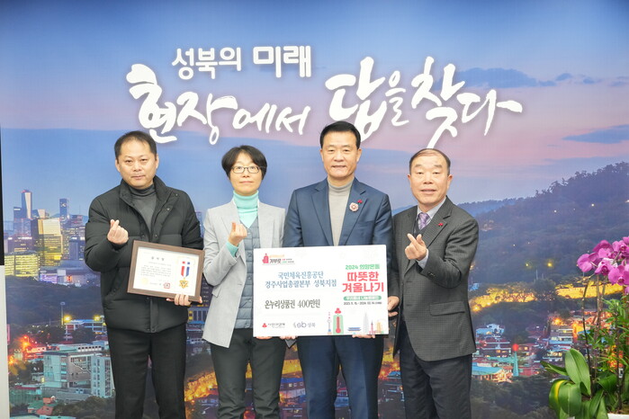 [시민일보 = 홍덕표 기자] 서울 성북구(구청장 이승로)는 최근 국민체육진흥공단 경주사업총괄본부 성북지점에서 취약계층 이웃들의 따뜻한 겨울나기를 위해 온누리 상품권 400만원을 기탁했다고 밝혔다.