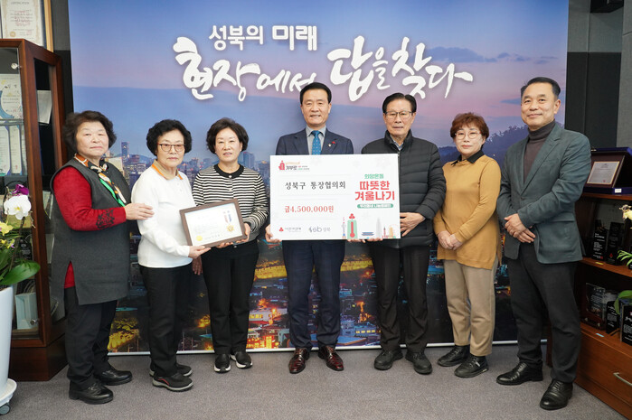 [시민일보 = 홍덕표 기자] 서울 성북구(구청장 이승로)는 최근 성북구 통장협의회가 따뜻한 겨울나기 성금으로 450만원을 쾌척해 지역사회에 온기를 불어넣었다고 17일 밝혔다.