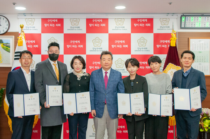 | ▲ 김형대 의장(가운데)과 결산검사 위원들(좌측부터) 노상만·염동훈·안지연·이도희·김유정·이원섭 위원이 기념촬영을 하고 있다.(사진=강남구의회 제공) |