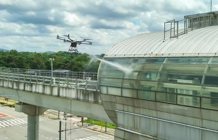 | 인천교통공사가 드론을 활용, 인천2호선 검단오류역사를 청소하고 있다. |