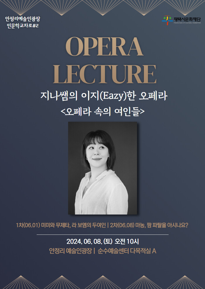 [평택=오왕석 기자] (재)평택시문화재단(대표이사 이상균)은 다양한 분야의 인문학 수업을 통해 지역 주민들의 문화 이해도를 높이고, 예술과 인문학에 대한 흥미를 자극하는 인문학 특강 ‘인문학 교차로’를 진행한다. 인문학 특강은 현대미술, 오페라, 뮤지컬 세 가지 주제로 다채로운 강연을 선보이고 있으며, 각 분야의 입문자를 대상으로 진행한다.