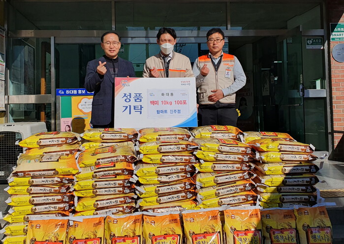 진주시 하대동 소재 탑마트 진주점(점장: 이기우)에서 21일 백미 10kg 100포를 행복 나눔 후원 성품으로 하대동 행정복지센터에 기탁했다.