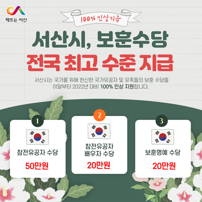 시는 이번 인상으로 민선8기 공약사항인 국가유공자 보훈수당 100% 인상을 완료했다.