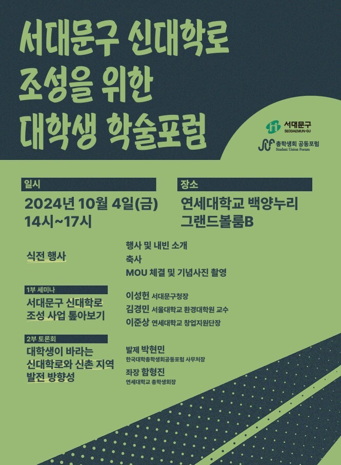 [시민일보 = 이대우 기자] 서대문구(구청장 이성헌)는 ‘한국대학총학생회 공동포럼’과 함께 이달 4일 오후 2시부터 5시까지 연세대학교 백양누리 그랜드볼룸B에서 ‘신대학로 조성을 위한 대학생 학술포럼’을 개최한다고 밝혔다.