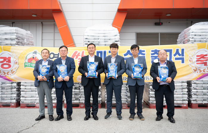 경기 여주시가 4일 점동면 통합 RPC에서 '대왕님표 여주쌀' 미국 수출 출고식을 했다. 사진은 출고식에서 이충우 시장(왼쪽 세 번째)이 관계자들과 기념촬영을 하고 있는 모습. (사진제공=여주시청)